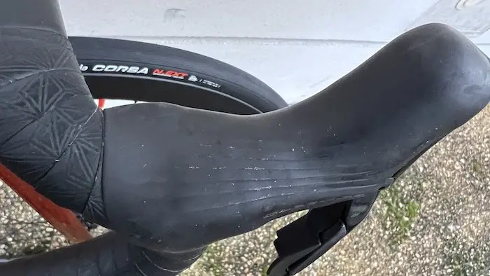 Du côté des poignées de frein, la finition des leviers est toujours de très bonne facture, et relativement peu sensible aux rayures, sauf en cas de grosse chute. Les caoutchoucs des cocottes de frein semblent un peu plus fermes que la version précédente, et moins affectés par les nombreux retroussages nécessaires pour affiner les réglages des poignées ou les changements de ruban de cintre. La texture pour assurer le grip parait en revanche s’user un peu plus vite.