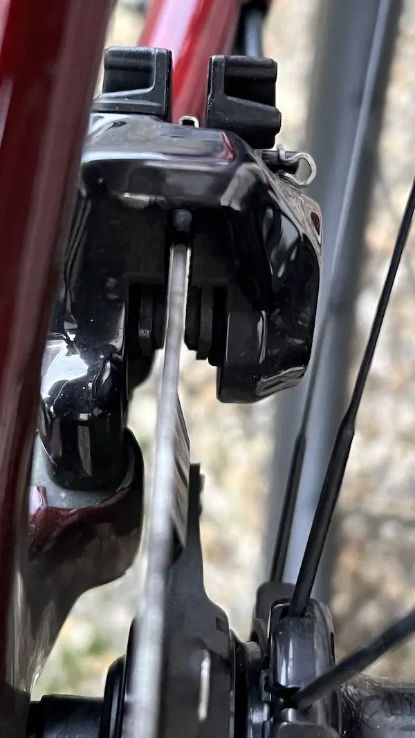 Pour le réglage du dérailleur, la base est de vérifier l’alignement de la patte de dérailleur. C’est un préambule absolument indispensable pour tout réglage, surtout en 12 vitesses. Il est possible qu’au moment de la livraison du vélo, la patte ait un peu bougé. Sinon, un truc à vérifier comme j’ai pu le voir récemment sur un dérailleur Di2 11 vitesses sur un autre vélo : vérifiez bien la butée de recul du dérailleur, celle qui permet d’ajuster la position des galets par rapport aux pignons. Si l’enroulement de la chaîne entre les galets et les pignons n’est pas idéal, cela peut causer un petit bruit sur les plus petits pignons.