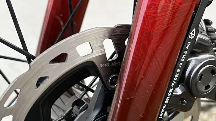 Aucun souci par contre du côté des disques (deux disques de 140 mm ici). Il y a très peu d’usure et ceux-ci semblent partis pour effectuer au moins 40 000 km. Mais toujours dans les conditions d’utilisation décrites plus haut. Notons qu’à chaque changement de roues, nous avons pris soin de reprendre les même disques, qui ont donc été rodés avec les plaquettes d’origine. Pour information, les disques Dura-Ace/XTR sont vendus au prix public de 90 € l’unité environ. Mais il est toujours possible de s’équiper de disques Ultegra/XT pour 60 € environ.