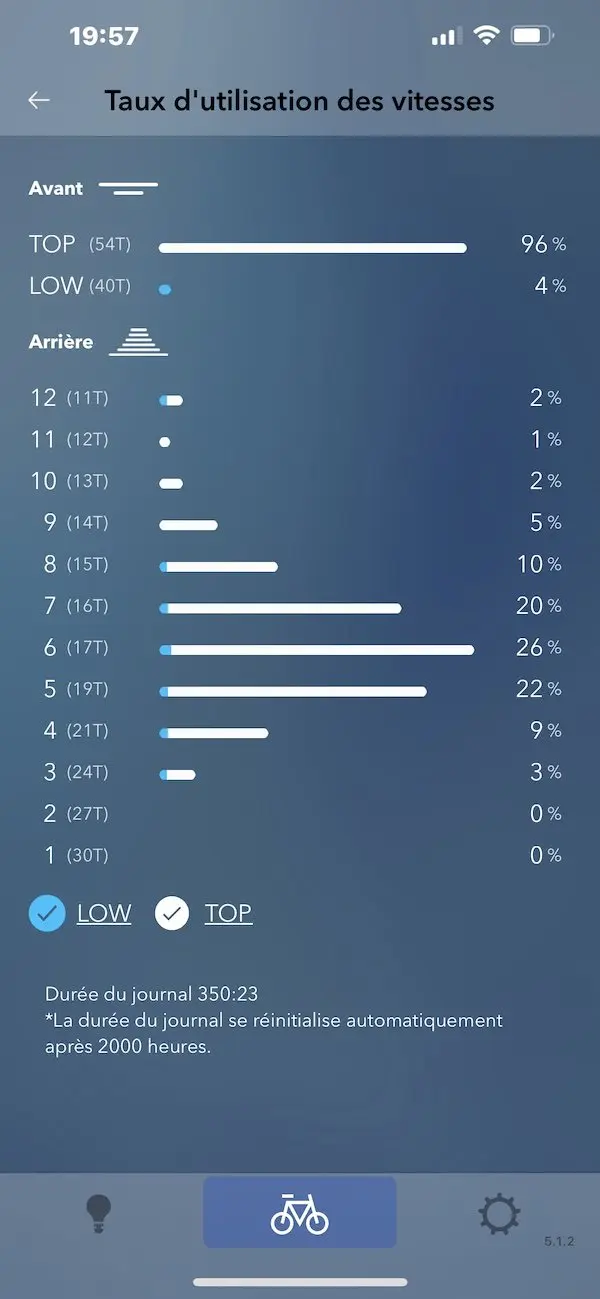 L’application propose aussi une information intéressante : les statistiques d’utilisation des différents rapports de transmission depuis la mise en route du groupe ou pour une sortie en particulier.