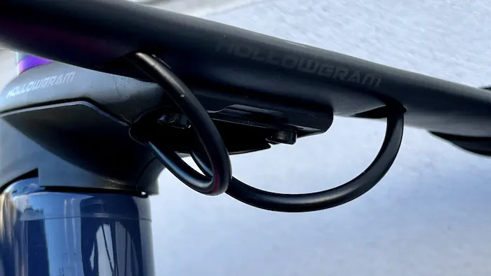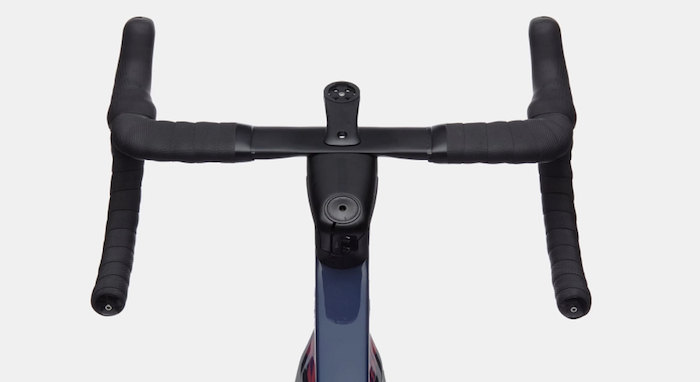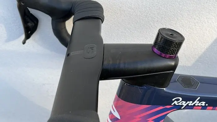 Après la large tige de selle profilée, l’autre pièce remarquable est le poste de pilotage, parfaitement aérodynamique et à l’esthétisme proche d’un combo intégré. Mais ici, le cintre est réglable, et peut s’ajuster en inclinaison sur 8 degrés, ce qui est un net avantage en termes de confort. Ce même cintre aux dimensions compactes et également légèrement évasé dans sa partie basse, offrant ainsi une superbe prise en main, que ce soit en position aéro sur les cocottes avec les coudes pliés, ou au sprint ou en relance avec les mains en bas. La partie haute en forme d’aile d’avion reste également confortable, même si le SystemSix n’a pas spécialement pour vocation d’affronter les longs cols en montagne.
