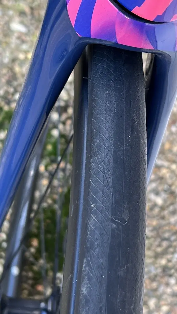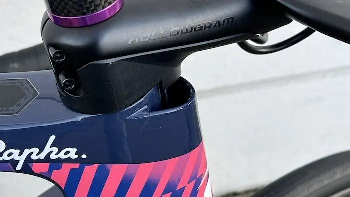 Avec des tubes massifs aux formes saillantes et surtout une intégration complète des durites de frein à l’intérieur du cadre et de la fourche, en passant bien sûr par le poste de pilotage – même si ici nous avons affaire à des gaines un peu longues eu égard au réglage en hauteur de la potence que nous avons choisi – le SystemSix impressionne. Sur l’avant de la douille de direction, on peut percevoir une protubérance, qui permet en fait le passage des durites devant les roulements. Ce système est plus simple que la plupart de ceux qui sont adoptés aujourd’hui par la concurrence à l’intérieur de la colonne de direction. En revanche, il a pour conséquence de limiter fortement le rayon de braquage du guidon. Ce n’est évidemment jamais un problème en roulant (sauf pour ceux qui veulent faire du surplace en équilibre au niveau des feux de signalisation), mais peut être un peu pénible au moment de ranger le vélo dans le coffre de la voiture, ou pire encore dans une housse de transport pour prendre le train ou l’avion.