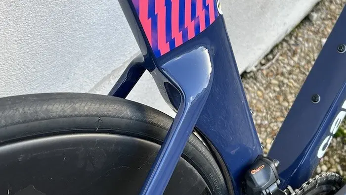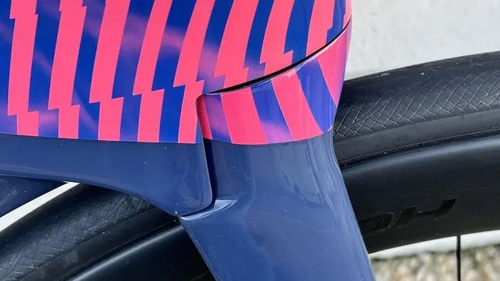 Au-delà des dimensions imposantes de tous les tubes et de la forme spectaculairement aérodynamique du tube de selle et de la tige du même nom, la fourche attire également notre attention, avec de larges fourreaux et surtout une superbe intégration esthétique au niveau de la jonction avec le tube diagonal. Plus en arrière, on remarque une énorme boîte de pédalier qui se prolonge avec de larges bases arrière, eux mêmes reliés à des haubans plus fins, mais qui prennent ancrage assez bas sur le tube de selle. Les tubes diagonal et supérieur ont un dessin désormais classique sur les vélos modernes, mais ils se distinguent là encore par leurs dimensions hors normes.