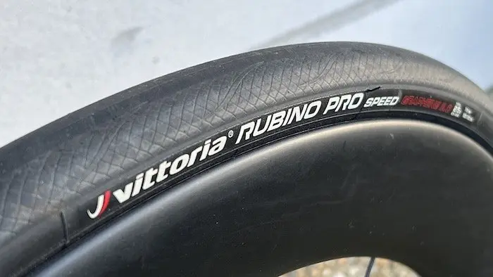 Les roues HollowGram KN0T64 de 64 mm de hauteur et 32 mm de large font aussi beaucoup pour le comportement global du vélo. Elles sont très rigides, et leur largeur permet aux pneus Vittoria Rubino Pro Speed de 700×25 d’être mesurés en réalité à 28,5 mm. La forme très légèrement bombée des jantes évite d’être trop déstabilisé avec le vent de côté, et offre une bel équilibre à l’ensemble de la machine à haute vitesse. On peut les sentir un peu lourdes au moment de lancer le vélo, mais une fois la vitesse de croisière atteinte, elles se montrent assez dynamiques. Du côté pratique, notons la présence d’axes traversant qui permettent une libération rapide de la roue, sans qu’il soit nécessaire de les dévisser totalement.