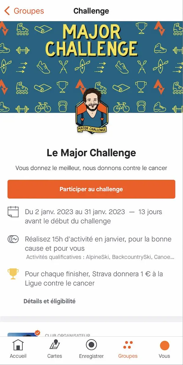 Pour démarrer l’année avec une bonne routine qui inspirera la suite de son année sportive, Strava et Major Mouvement, le kiné star qui rend la santé accessible au plus grand nombre, ont créé le Major Challenge. Ce défi encourage à pratiquer 15 heures d’activités physiques tout au long du mois de janvier. Qu’il s’agisse d’un tour à vélo, d’une sortie à ski ou d’une balade au parc, chacun des 39 sports de Strava est éligible. Et pendant que les participants au challenge donneront le meilleur d’eux-mêmes, Strava récompensera leurs efforts en versant 1 € à la Ligue contre le cancer pour chaque athlète qui aura atteint l’objectif de 15h d’efforts, dans la limite de 20 000 €. Le challenge remporte déjà un franc succès avec plus de 106 000 participants à ce jour. S’ils le souhaitent, les finishers sont également invités à faire un don à la Ligue contre le cancer.