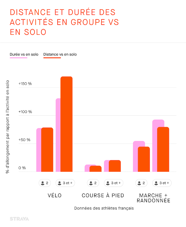 « Ensemble, nous allons plus loin », mais aussi plus vite et pendant plus longtemps. Avec son dernier rapport annuel, Strava en apporte la preuve. Ainsi, les athlètes qui se sont entraînés à deux ont enregistré des distances et des durées plus longues qu’en solo. En groupe de trois ou plus, les chiffres étaient d’autant plus supérieurs. En janvier, les cyclistes et les coureurs qui ont pris part à des activités de groupe ont enregistré un temps d’activité respectivement 87 % et 78 % plus long que leurs homologues ayant pratiqué leur sport en solo.