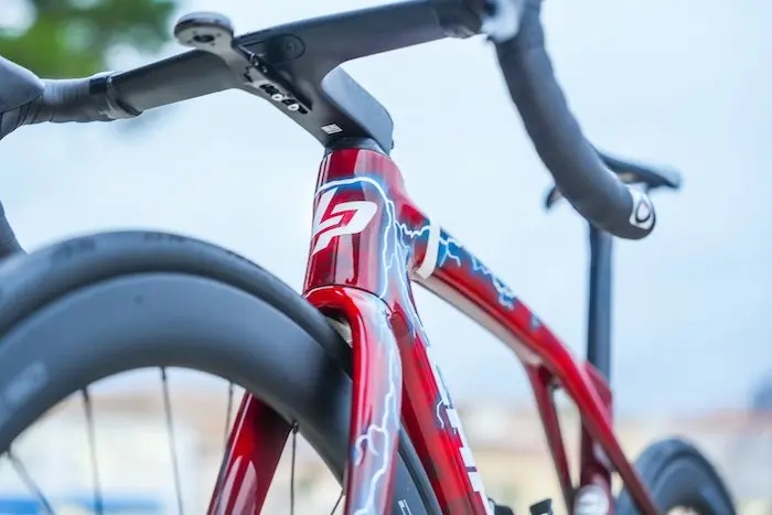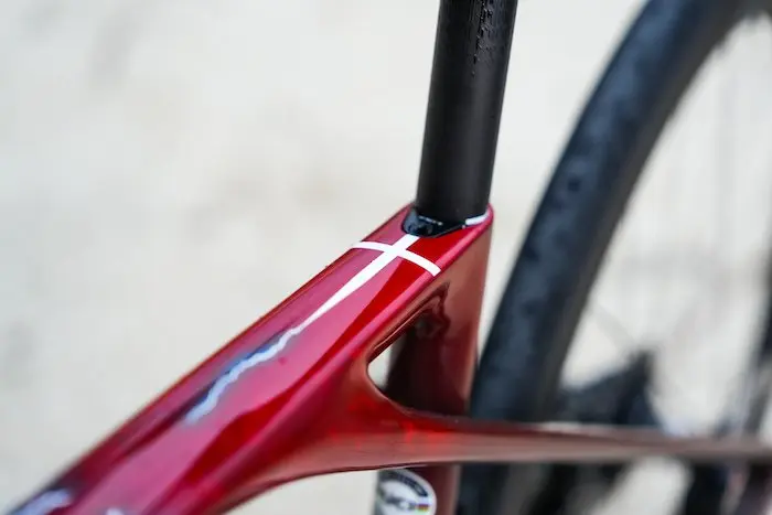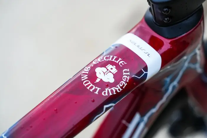 La petite croix placée sur le tube supérieur et se finissant avec un éclair est aussi un petit clin d’oeil au drapeau du Danemark, à la culture viking, mais aussi au titre de championne nationale obtenu par Cécilie Uttrup Ludwig en 2022.