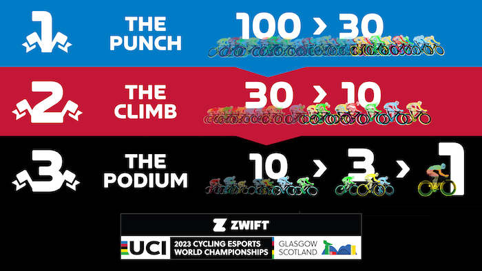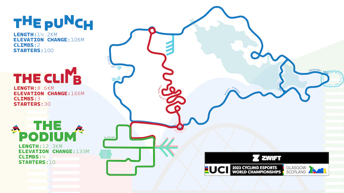 Parmi les 100 coureurs qui prendront le départ, seuls les 30 premiers à franchir la ligne d’arrivée se qualifieront pour la seconde course. Après une courte pause, ces 30 qualifiés prendront le départ de The Climb, une course de côte au scratch organisée sur le parcours en ville et sur le Sgurr, toujours en Écosse. Ce parcours de 8,6 kilomètres avec 161 mètres de dénivelé éprouvant pour chaque tour mettra les coureurs au défi de gravir à plusieurs reprises la côte la plus difficile du nouveau monde écossais. Seuls les dix premiers se qualifieront pour la troisième étape. La troisième et dernière course des championnats du monde UCI de cyclisme esports 2023, The Podium, se déroulera sur le circuit Crit de Glasgow, une boucle de 3 kilomètres avec 33 mètres de montée. Pour la première fois dans un championnat du monde de cyclisme esports, cette course finale se présentera dans un format d’élimination. Populaire dans le cyclisme sur piste, la course par élimination déplace l’action de l’avant du peloton vers l’arrière ; à chaque tour, le dernier coureur à franchir la ligne d’arrivée sera éliminé de la course. Lorsque le peloton aura été réduit de 10 à 3 coureurs, les derniers cyclistes restants se disputeront la victoire et le classement sur les marches du podium.