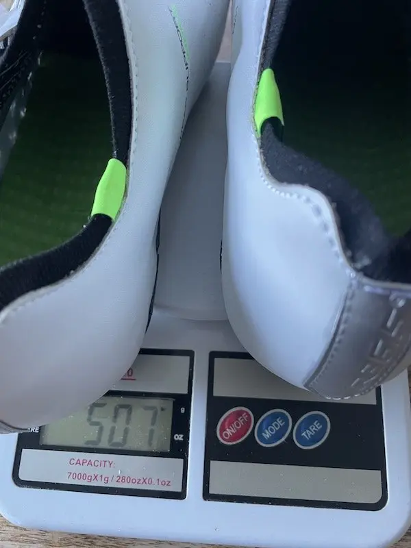 Q36.5 frappe fort avec cette paire de chaussures au niveau du poids : 507 g pour notre paire d’essai en 41, soit une centaine de grammes en moins que des Sidi Shot 2, mais une cinquantaine en plus que des Specialized S7 ou bien encore les dernières Shimano S-Phyre RC903. On est ici sur des chaussures très haut de gamme.