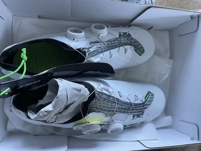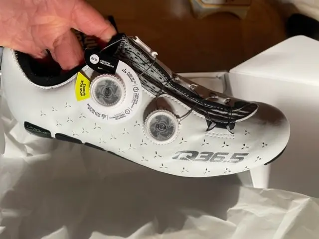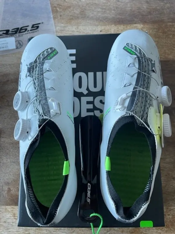 Bien qu’habitué à des 41 Shimano, moulant mon pied, les 40 et même 40,5 ne m’ont pas convenu. Q36.5, c’est un coté humain que l’on retrouve rarement. Trois paires de chaussures m’ont été envoyées, afin de choisir la bonne taille. Oui, c’est une marque aux petits soins pour vous, et cet acte fait parti de cela et de leur philosophie. Une fois la bonne pointure adoptée, on se sent comme dans des pantoufles après les avoir enfilées. C’est assez simple, ceci est dû à la tige qui est d’une construction dite en chaussette, une technique qu’utilisait Mavic sur ses chaussures, avec à l’époque un tarif très élevé.