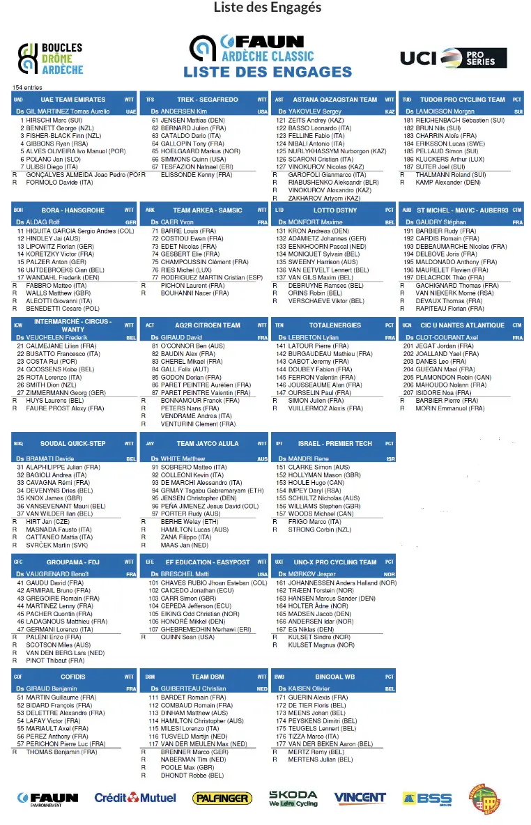 La liste des engagés de la Faun Ardèche Classic 2023
