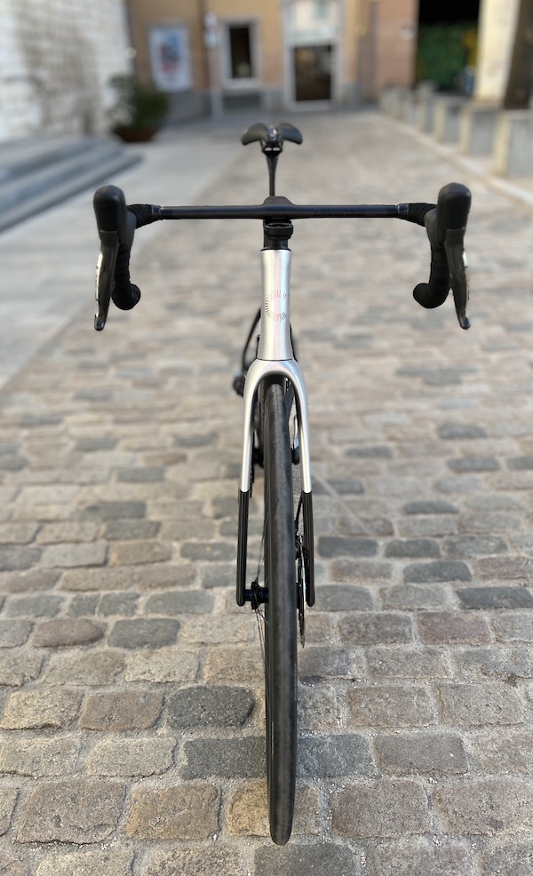 Question confort, le nouveau SuperSix Evo conserve là encore ce qui a fait son succès depuis une quinzaine d’années : le contact avec la route est plutôt soft, même ici avec des pneus (avec chambres à air) de 25 mm de section, alors que le vélo peut supporter des sections jusqu’à 34 mm (comme son prédécesseur). Même avec une dimension plutôt typée « course », le vélo absorbe correctement les petites irrégularités de la chaussée, sans avoir besoin de passer par des grosses sections sous-gonflées, qui induisent forcément plus de poids, moins de rendement, et moins de nervosité en relance.