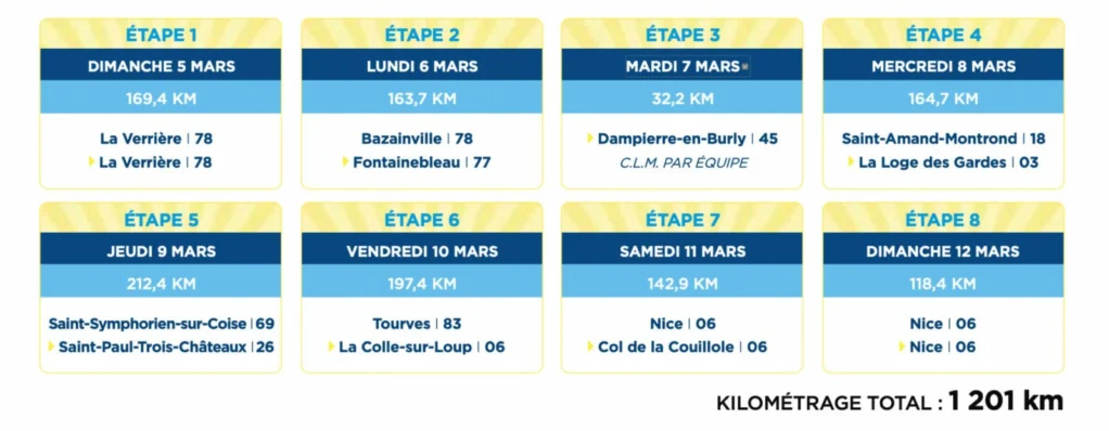 Partager la publication "PROS – Paris-Nice 2023 : le parcours, les cartes et profils des étapes, les cols et les horaires de diffusion TV de la 81e édition"