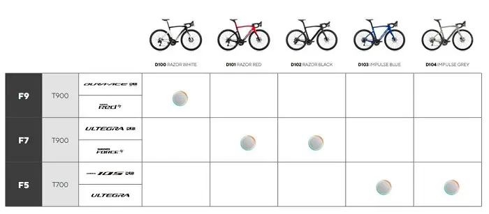 – T700 : utilisé sur le modèle F5, elle conserve une excellente réactivité et des performances élevées mais avec une plus grande capacité à absorber les vibrations de la route. Le polymère renforcé de carbone (CFRP) est utilisé pour optimiser chaque section du cadre afin d’obtenir la rigidité souhaitée et légèreté. Par exemple, dans les zones où la rigidité est privilégiée, une fibre à haut module (HM) est choisie, alors que dans les zones où la résistance est essentielle, une fibre à haute résistance (HT) est préférée. Ce choix contribue à prévenir la casse.
