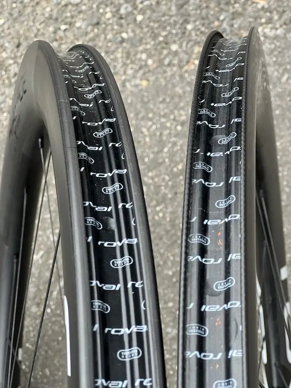 Les jantes avant et arrière sont de hauteurs différentes, avec 51 et 60 mm, mais aussi de largeurs externes différentes, avec 35 mm à l’avant et 30 mm à l’arrière, afin de favoriser l’aérodynamisme et de rendre les mouvements de la roue avant plus prévisibles lors du pilotage. La jante avant est nettement bombée et a une forme quasiment ovale, alors que l’arrière est un peu plus effilée. La largeur interne pour les deux jantes reste de 21 mm, ce qui rend les roues idéales pour des pneus de 25 à 30 mm de section. Cette version compatible tubeless conserve des crochets et peut donc être montée avec toutes les marques de pneus, et bien sûr avec des pneus à chambre à air également. Le montage des pneus tubeless ou à chambre à air se montre viril mais sans difficulté particulière. Sauf avec des pneus Continental GP 5000, comme c’était déjà le cas avec les premières Rapide.