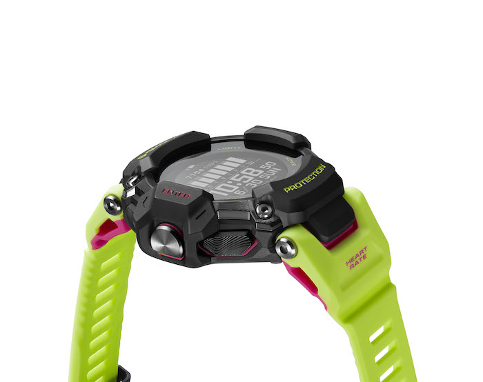 Équipée d’une fonctionnalité GPS et de 6 capteurs lui permettant de couvrir une variété de mouvements, la GBD-H2000 est 38% plus légère que sa prédécesseur, la GBD-H1000. Cela est rendu possible grâce à un boîtier plus compact intégrant une antenne GPS, et dont le dos est renforcé en fibres de carbone. Cela participe également à un ajustement encore plus confortable au poignet. La nouvelle montre dispose d’un capteur optique pour mesurer la fréquence cardiaque, ainsi que d’une boussole, d’un capteur d’altitude/de pression atmosphérique, d’un capteur thermique, d’un accéléromètre et d’un gyroscope pour détecter les mouvements du corps.