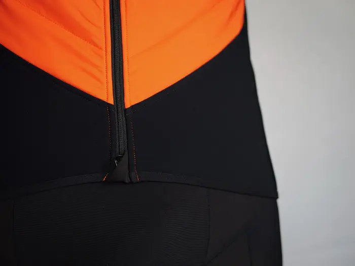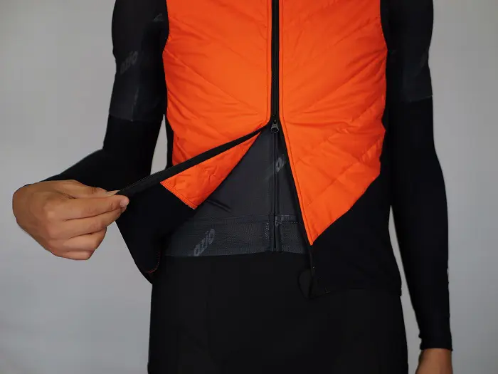 Dans le cas du gilet Ozio, l’utilisateur remarquera immédiatement un aspect intéressant : l’ouverture du zip peut se faire par le haut (de manière traditionnelle) mais aussi par le bas : un gros plus pour l’accès aux poches arrière du maillot situé en dessous mais aussi une bonne opportunité de ventiler dans une zone (le ventre) où la sudation est souvent supérieure du fait de la sur épaisseur du cuissard ou du collant. De plus, tout d’abord pour des raisons de coupe de l’aveu même du créateur de la marque, la partie basse du gilet ne possède pas de membrane : un atout donc pour coïncider avec des morphologies variées de cyclistes car ce tissu est plus élastique que les parties matelassées, mais également une façon supplémentaire de favoriser l’évacuation de la chaleur quand la température et/ou l’intensité tendent à augmenter.