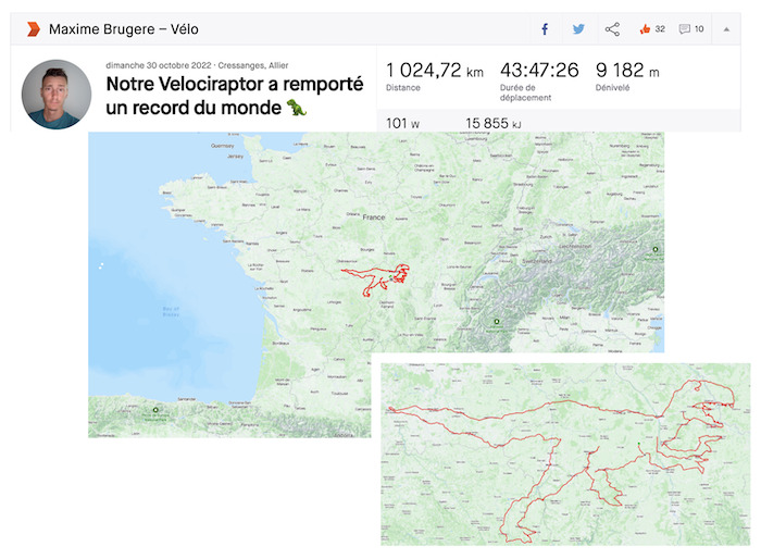 Entre le 30 octobre et le 5 novembre derniers, quatre Français se sont lancés le pari fou de dessiner un vélociraptor de pas moins de 1025 km à vélo. Cette pratique connue sous le nom de Strava Art leur a permis de décrocher cette semaine un record du monde officiel.