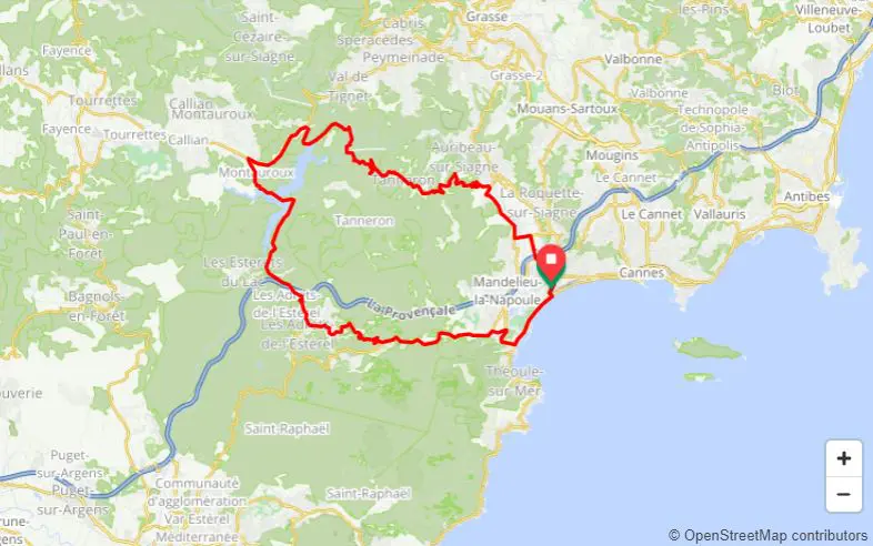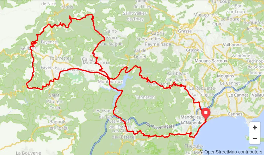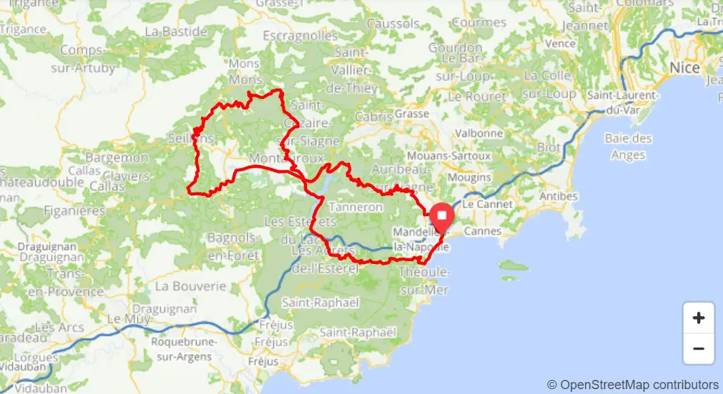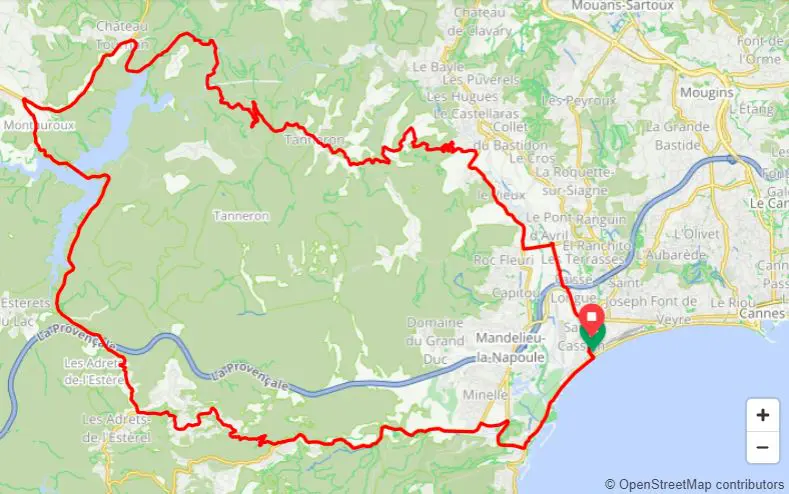 La carte du petit parcours de 57 km du GFNY Cannes 2023