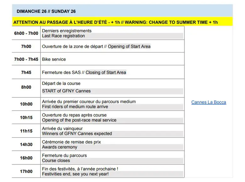 Les horaires de départ et le programme du GFNY Cannes 2023