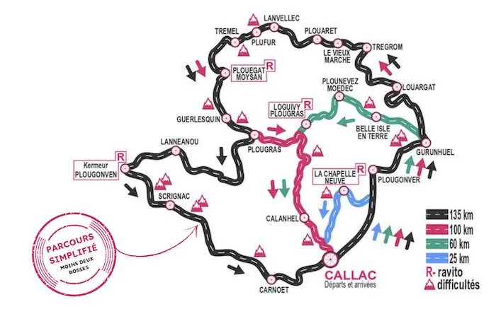Ouverte aux petits comme aux grands, aux passionnés comme aux novices, cette journée se veut accessible à toutes et tous ! Pour cette 31è édition, le programme est plus que séduisant ! Les 4 parcours proposés en 2022 sont reconduits cette année. A noter, la simplification du 135 km. Il y aura 2 bosses en moins après Scrignac afin de réduire le dénivelé. Faites votre choix parmi les parcours proposés !