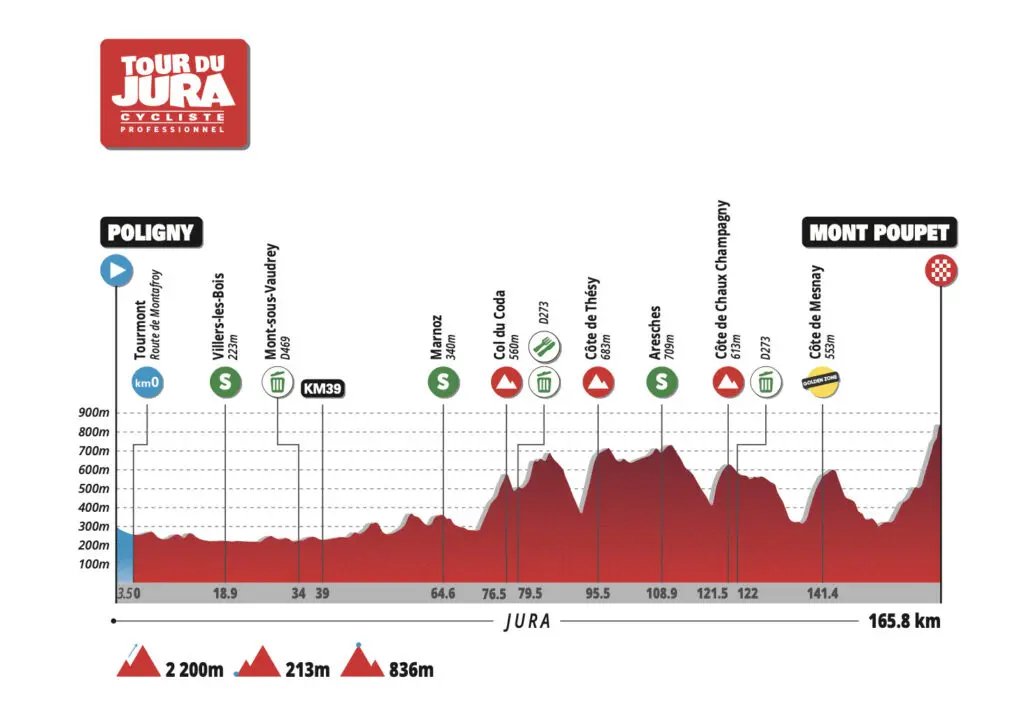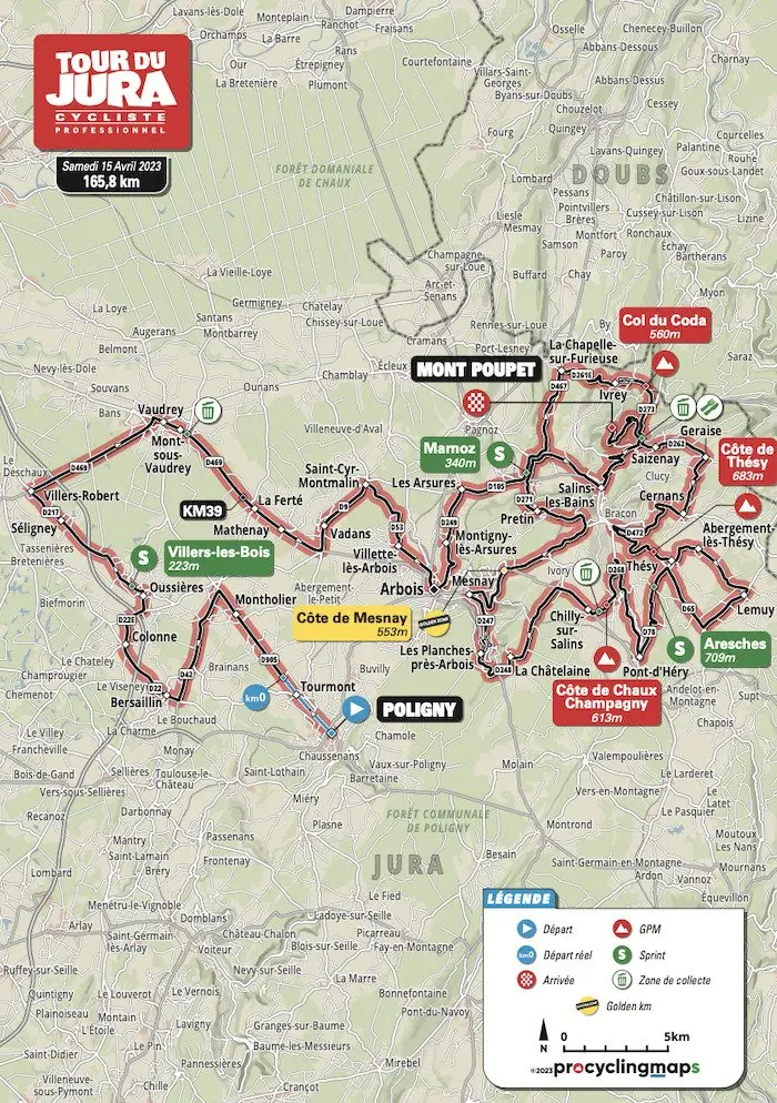 La 20e édition du Tour du Jura Cycliste se dispute ce samedi 15 avril, avec 165,8 kilomètres au programme entre Poligny et le Mont Poupet. Retrouvez le parcours, le profil, les horaires et la liste des engagés.