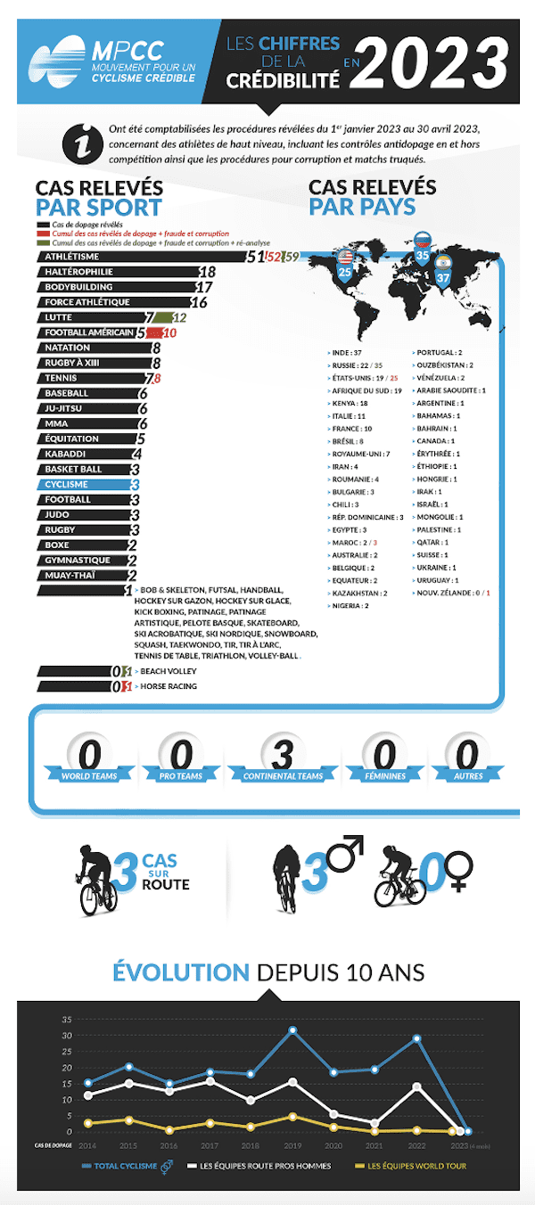 Aucun de ces cas révélés ne concerne une équipe membre du MPCC. Le mouvement regroupe 40 équipes pros de première et deuxième division (hommes et femmes) pour seulement 16 équipes continentales. Le MPCC encourage vivement l’adhésion de ces formations semi-professionnelles à la cause du MPCC, afin d’inscrire leur éthique et leur crédibilité au cœur des préoccupations de notre sport.