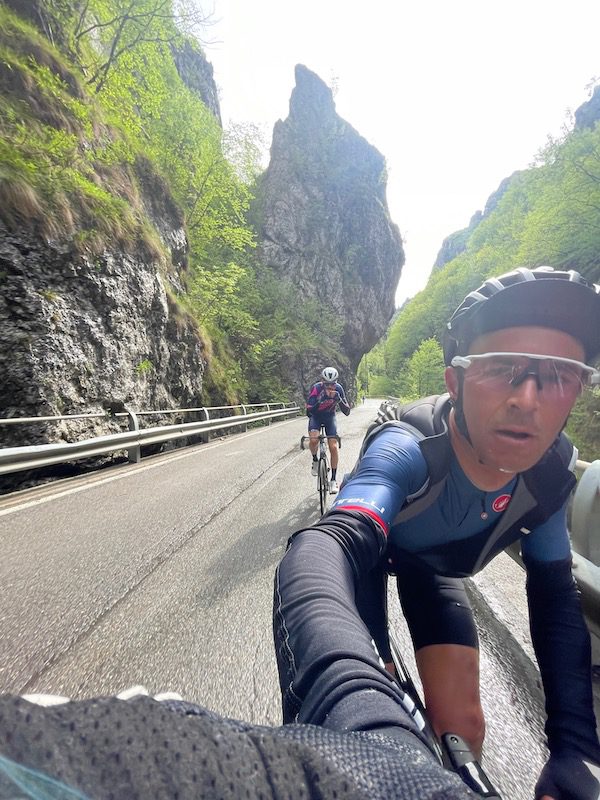 Ca pétille ! Ici le groupe dans lequel je suis ralentit, et je continue avec un bon rouleur qui n’est pas avare de ses efforts pour partir dans cette vallée. Aucune idée de ma place, ni des écarts, je ne m’occupe que de moi et de mes jambes. On lisse l’effort et arrivons ensemble après avoir passé les termes de San Pellegrino (bien penser à boire) au pied d’une nouvelle bosse.