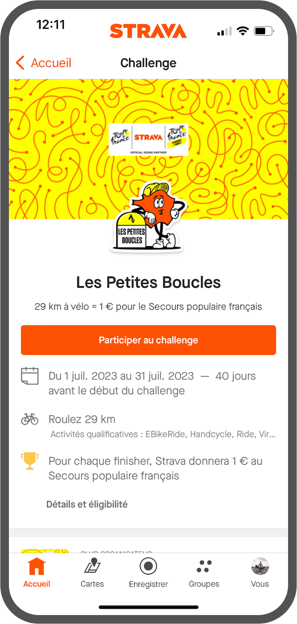 Pour encourager une pratique encore plus large et pérenne via Les Petites Boucles, Strava récompensera chaque personne qui atteindra l’objectif du challenge en donnant 1€ au Secours populaire français – dans la limite de 40 000 €. Ce don contribuera au financement de plus de 500 vélos utilisés par l’association et ses fédérations lors du Tour de France et du Tour de France Femmes avec Zwift afin de favoriser l’accès à la pratique sportive et à la mobilité.