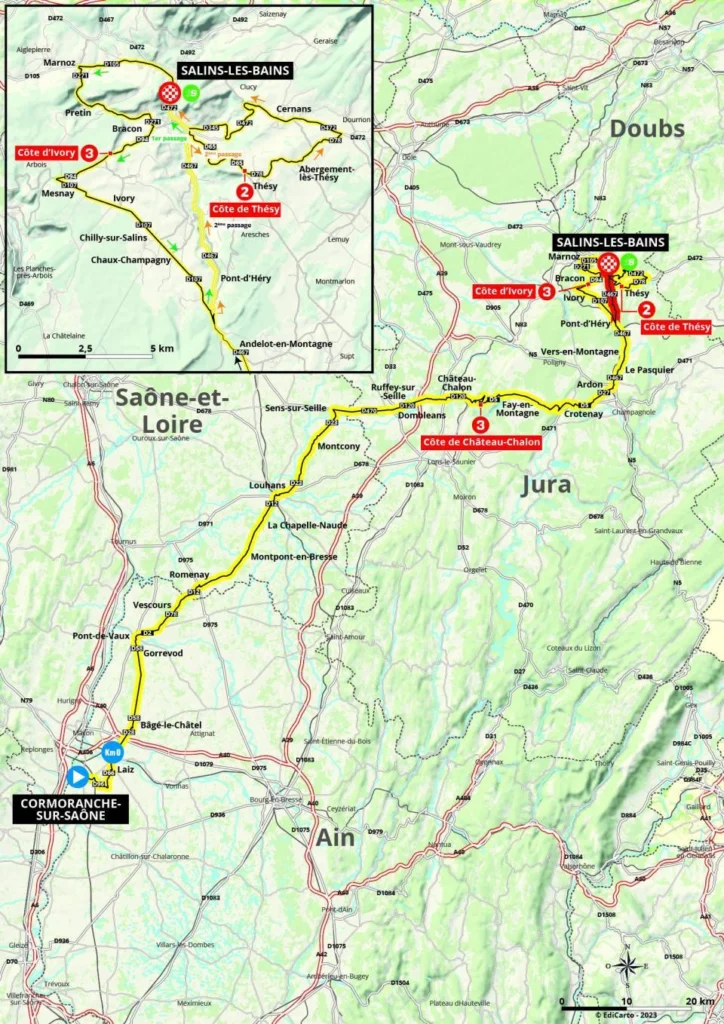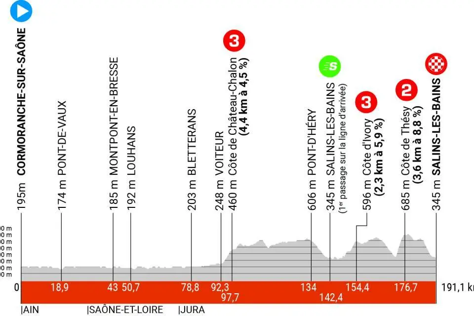 Jeudi 8 juin – Étape 5 – CORMORANCHE-SUR-SAÔNE > SALINS-LES-BAINS – 191,5 km – Accidentée