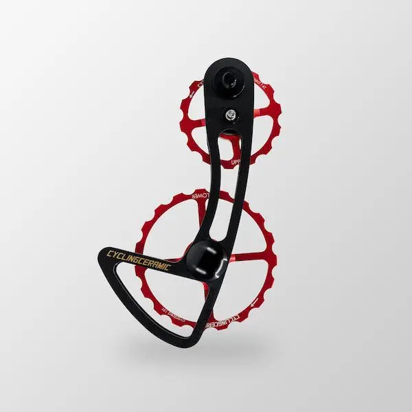 La chape est disponible en 4 couleurs (rouge, noir, bleu et Gold) avec galet en aluminium et plaques en carbone UD. La chape CyclingCeramic permet également d’augmenter la capacité de la cassette la passant de maximum 34 dents à 36 dents.