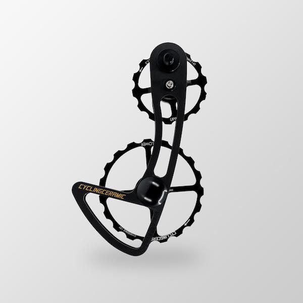 La chape est disponible en 4 couleurs (rouge, noir, bleu et Gold) avec galet en aluminium et plaques en carbone UD. La chape CyclingCeramic permet également d’augmenter la capacité de la cassette la passant de maximum 34 dents à 36 dents.