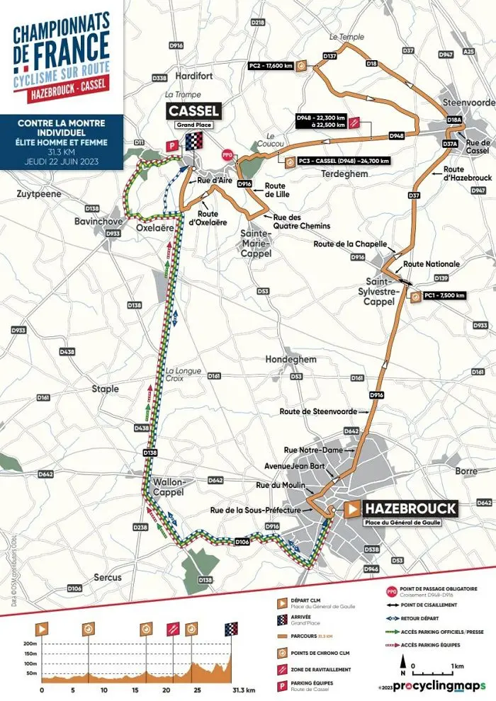 Le parcours développera 31,3 kilomètres, pour un dénivelé positif notable de 375 m, ce qui en fera un Contre-La-Montre exigeant, surtout dans sa dernière partie, avant l’arrivée sur Cassel. Quant au départ, il sera donné de Hazebrouck.