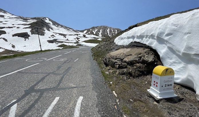 À 2642 m, l’atmosphère encore un peu fraîche, au milieu des névés, le col à été ouvert il n’y À qu’une semaine, mettre un petit gilet sera peut être conseillé, à vous de voir. Ce qui est obligatoire, c’est de remettre un peu du carburant, du sucre, dans votre machine. La Marmotte, plus que toute épreuve, vous fait sentir au fil des kilomètres, du dénivelé, une vidange progressive de celui-ci. Alors maintenant, il va falloir gérer cette portion proche des 50 kilomètres pour rallier Bourg d’Oisans et aborder la montée de l’Alpe avec le plus de forces encore possible.