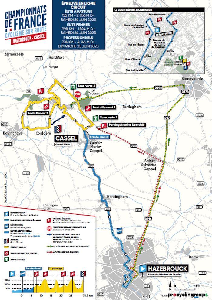 Les courses sur route des championnats de France de cyclisme 2023 se déroulent samedi et dimanche 24 et 25 juin à Cassel dans le Pas-de-Calais. Le circuit est particulièrement exigeant avec deux ascensions au programme : la montée de la porte de Dunkerque en pavés (1,9 km à 4%) et la montée de la porte d’Aire (1,2 km à 8%). 224 kilomètres seront à parcourir pour les coureurs professionnels, avec plus de 4000 mètres de dénivelé positif. Julian Alaphilippe (Soudal-Quick Step) apparait comme le grand favori.