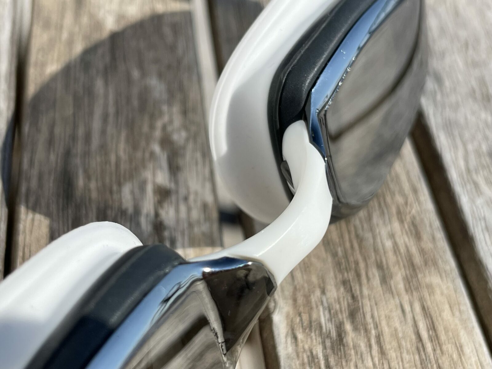 Dans l’eau, le joint interne laisse tout de même un peu d’eau s’infiltrer, au fil des longueurs. Pas possible d’enchaîner un 1 500 m – par exemple – sans un petit arrêt en bout de ligne pour réaliser une petite vidange. Ce n’est pas très gênant, quelques gouttes seulement. Ce qui l’est un peu, c’est le confort de ce joint, notamment dans sa partie basse, vers l’intérieur de l’oeil. Après plusieurs minutes, en piscine comme en mer, nous avons ressenti un point de tension et d’appui prononcé qui s’est intensifié au fil des minutes. Pas au point d’arrêter l’entraînement ; mais suffisant pour ressentir le besoin de réajuster les lunettes avant de replonger.
