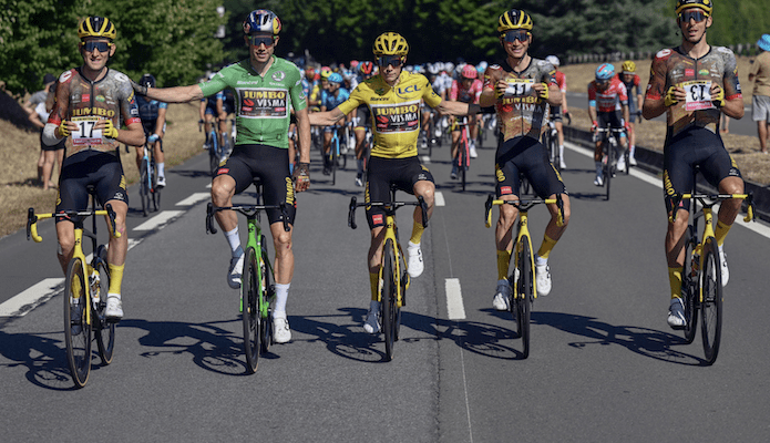 Cervélo lance une vidéo promotionnelle avec les coureurs de l’équipe Jumbo-Visma pour présenter une nouvelle fois sa gamme de vélos de niveau 5 (S4, R5, Caledonia 5, P5), que Jonas Vingegaard, Wout van Aert ou Christophe Laporte utiliseront pendant le Tour de France.