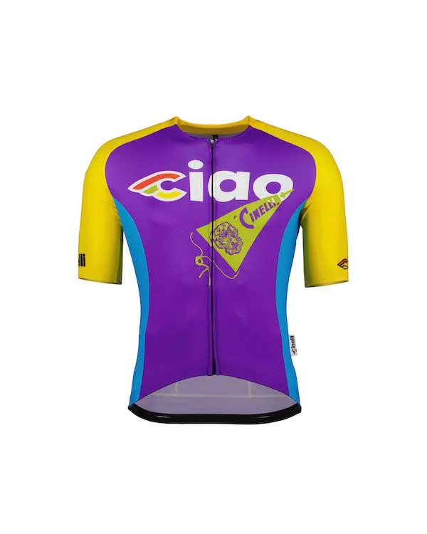Le maillot Ciao Icon présente une nouvelle coupe plus performante, avec des manches plus longues, une fermeture éclair à came, des tissus contrastés pour le corps et les manches et un col aérodynamique, ainsi qu’une myriade d’autres détails de conception petits mais significatifs qui reflètent la culture de la marque Cinelli.