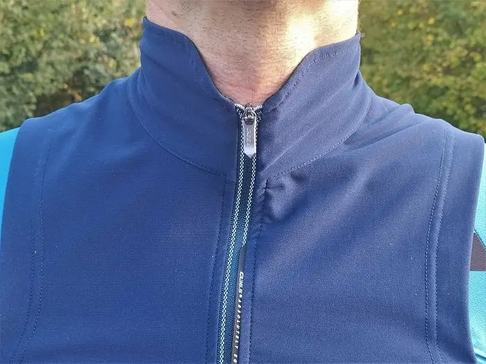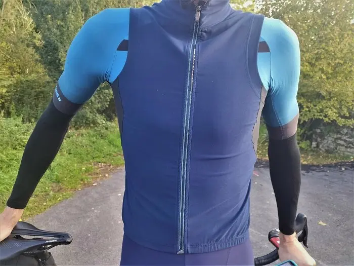 En roulant, l’impression laissée par le gilet L1 est que Q36.5 maitrise véritablement son sujet et que le discours sur son tissu Hybrid Shell n’est pas marketing : en roulant par temps frais voire froid, et contrairement à un gilet coupe vent classique qui bloque toute entrée d’air, le cycliste ressent ici de façon extrêmement atténuée une faible quantité d’air passant à travers le tissu. Pas de quoi nuire à l’efficacité du vêtement face au vent et à la vitesse de déplacement mais à l’inverse, le gain en respirabilité est parfaitement palpable : il reste possible de réaliser des efforts en intensité sans devoir ouvrir en intégralité la fermeture éclair. Ainsi le cycliste ne ressent pas le besoin de manœuvrer sans cesse le curseur de la fermeture éclair pour s’adapter à l’environnement ou à l’effort.