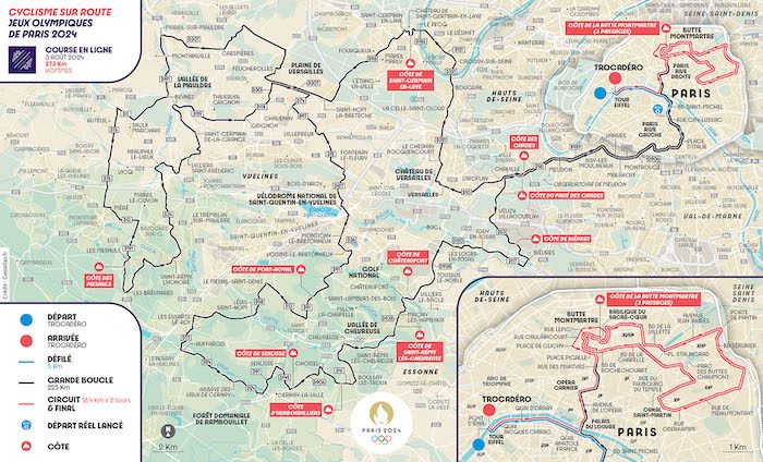Les parcours des courses en ligne et contre la montre hommes et femmes des JO de Paris 2024 ont été dévoilés. 273 km et 2 800 m de dénivelé sont annoncés pour la plus longue course olympique de l’histoire, avec une longue escapade dans les Yvelines et la Butte Montmartre à escalader à trois reprises sur circuit final, après un départ à la Tour Eiffel et avant une arrivée au Trocadéro.