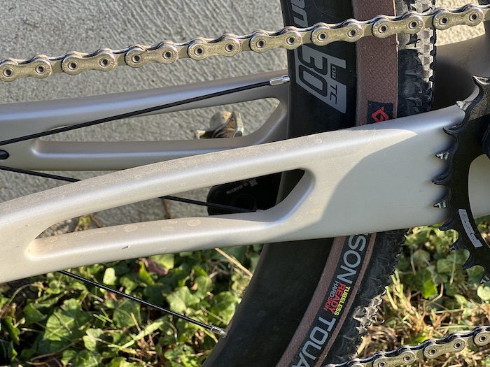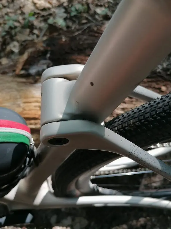 Cette nouvelle version du GravelX se distingue par un triangle arrière articulé, avec des haubans fixés assez bas sur le tube de selle, mais montés sur une biellette qui assure une légère flexion pour absorber les vibrations, améliorer le confort et optimiser la motricité de la roue arrière. Une encoche au niveau des bases arrière diminue leur rigidité verticale, ce qui permet de favoriser cette légère flexion, vraiment sensible sur le terrain.
