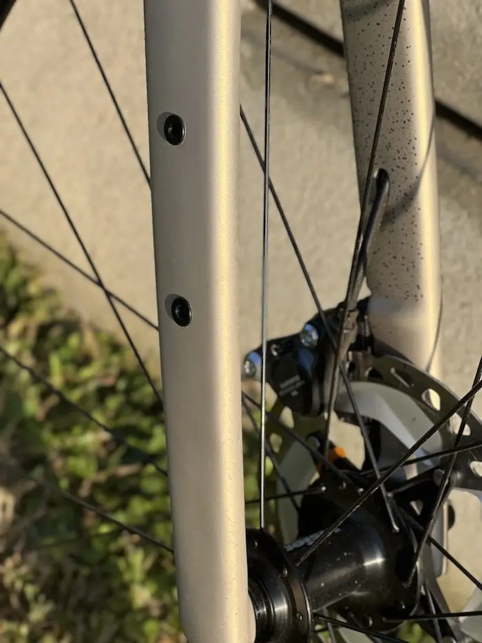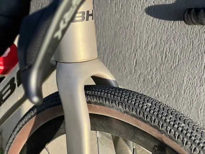 Au niveau de la tête de fourche, on observe un net décrochage juste en dessous de la douille de direction. La fourche Air Bow a une forme particulière, tout comme pour les vélos de la gamme route de BH. Des formes courbes qui permettent de surdimensionner au maximum le passage de roues (pour des pneus jusqu’à 45 mm), sans altérer la rigidité latérale et la précision de pilotage, et qui optimisent l’écoulement de l’air pour favoriser le gain de vitesse. Le GravelX bénéficie également d’une belle intégration des durites de frein et des câbles ou fils de dérailleur dans la douille de direction, pour favoriser l’esthétisme et l’aérodynamisme.