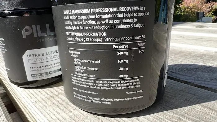 Ainsi, lorsque l’importateur de la marque australienne Pillar m’a proposé de tester le Triple Magnesium, j’étais plutôt dubitatif. Sous forme de poudre aromatisée à dissoudre dans un verre d’eau, ce produit contient trois formes sélectionnées de magnésium bio-disponible, conçues pour offrir ensemble un soutien pour la fonction neuromusculaire et la récupération. Le Triple Magnesium contient pour chaque portion (deux dosettes par jour, soit 50 jours pour une boîte de 200 g) 258 mg de citrate de magnésium, 840 mg de chélate d’acide aminé de magnésium, et 341 mg de glycinate de magnésium dihydraté. Ce qui représente l’équivalent de 248 mg de magnésium élémentaire total, alors qu’une dose journalière de 300 mg au maximum est recommandée, pour éviter les problèmes intestinaux. Le produit est proposé avec deux arômes, ananas/coco comme pour ce test, ou fruits rouges, ce qui rend le supplément très agréable à consommer.