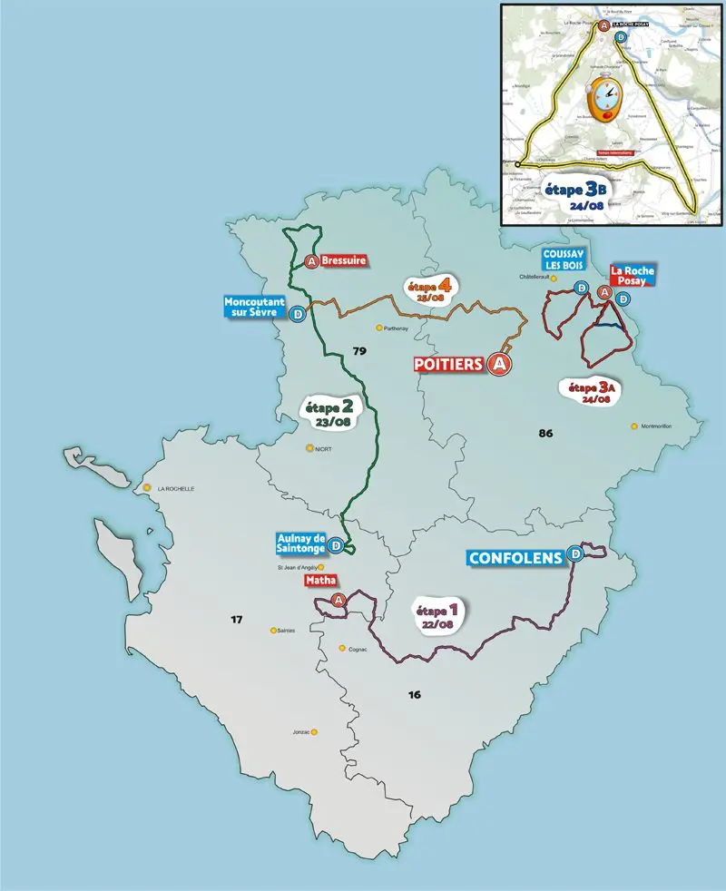 Le Tour Poitou-Charentes en Nouvelle-Aquitaine 2023 se déroule du 22 au 25 août, entre Confolens et Poitiers. Retrouvez le détail des étapes et la liste des engagés.