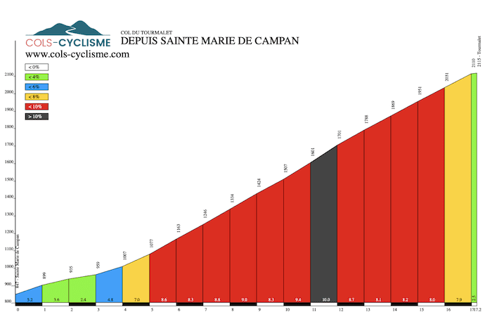 18 km pour 1300 m de dénivelé. Ce Tourmalet versant Luz est un col très régulier, on oscille constamment entre 7 et 8% excepté sur une portion à la sortie de la station de Barèges (après 8 km) frôlant les 10% et sur le dernier kilomètre qui lui sera constamment à 10 %.