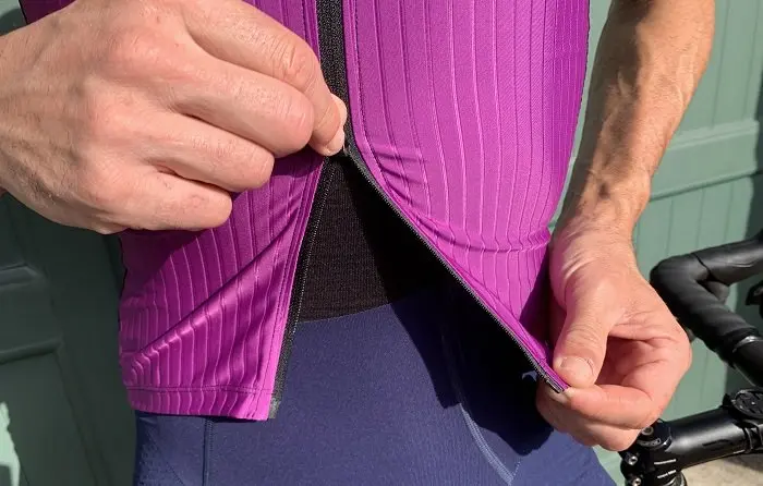 Un autre petit plus, rare sur les maillots mais plus souvent présent sur les gilets afin de permettre un bon accès aux poches arrière, est la présence d’un zip avec un double curseur. Ceci favorise une ventilation supérieure en ouvrant partiellement le maillot par en-dessous, sans que le chargement ne se promène de part et d’autre.