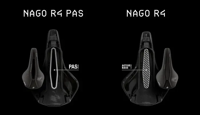 La version ouverte Nago R4 PAS, dispose d’une coque avec deux sections latérales complètement séparées et indépendantes. Elle est produite avec de la mousse de dernière génération à densité variable. Elle vise à assurer un excellent soutien et un confort adéquat pendant toutes les phases du pédalage. Au centre de la selle, il y a le système Prologo PAS : un grand canal central associé à une base perforée, pour éliminer la pression atteint son maximum même lors d’une poussée maximale sur les pédales.