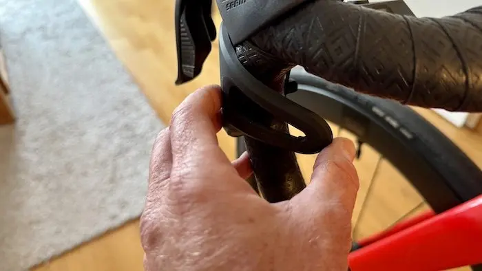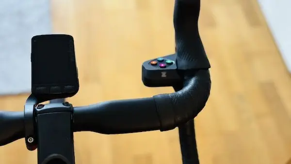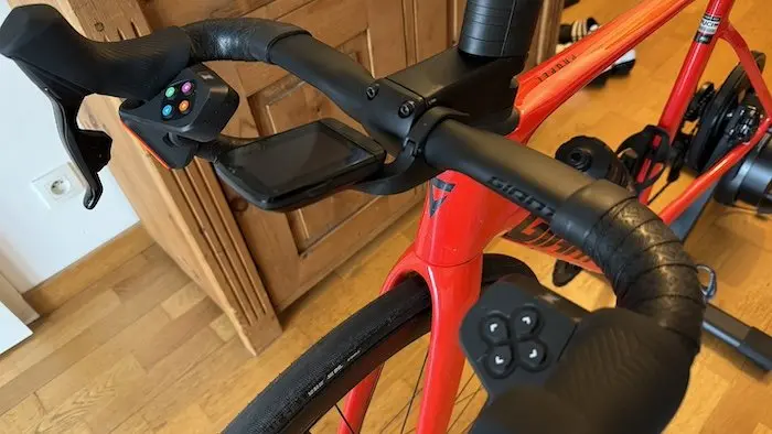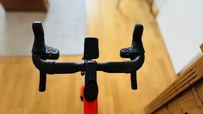 Les manettes Zwift Play s’installent sur un cintre typé course (et uniquement typé course, en raison de leur forme), et se placent juste en dessous des poignées de frein du vélo à l’aide d’un gros élastique intégré. C’est simple et efficace, la prise en main est assez facile après quelques minutes d’utilisation. Elles se connectent en bluetooth à l’ordinateur, tablette ou smartphone utilisé pour l’application Zwift, de la même manière que le home-trainer. Il n’y a que dans le cas d’une utilisation avec une Apple TV que la connexion peut être plus compliquée, car celle-ci n’accepte qu’un nombre limité de source bluetooth. Il peut donc être nécessaire de se servir du smartphone comme appareil intermédiaire pour regrouper toutes les autres connexions bluetooth utilisées pour l’application d’entrainement (home-trainer, capteur de fréquence cardiaque, capteur de puissance éventuel et donc les Zwift Play). De par leurs fonctionnalités, les Zwift Play peuvent s’utiliser avec n’importe quel home-trainer (et pas seulement avec un home-trainer Zwift Hub), mais uniquement sur Zwift.