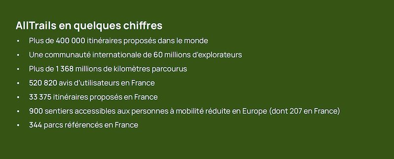L’équipe à l’origine de l’application AllTrails est motivée par la mission de faire découvrir le plein air au plus grand nombre de personnes et dans le plus grand nombre possible d’endroits. En offrant aux utilisateurs des fonctionnalités leur permettant de planifier et d’explorer en toute confiance, AllTrails facilite l’accès aux activités de plein air pour tous et aide des millions de personnes à travers le monde à profiter des bienfaits du temps passé dans la nature, aussi bien sur la santé physique que mentale. L’application gratuite a développé une communauté de plus de 60 millions de membres et propose plus de 420 000 itinéraires sélectionnés dans 191 pays.