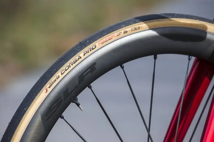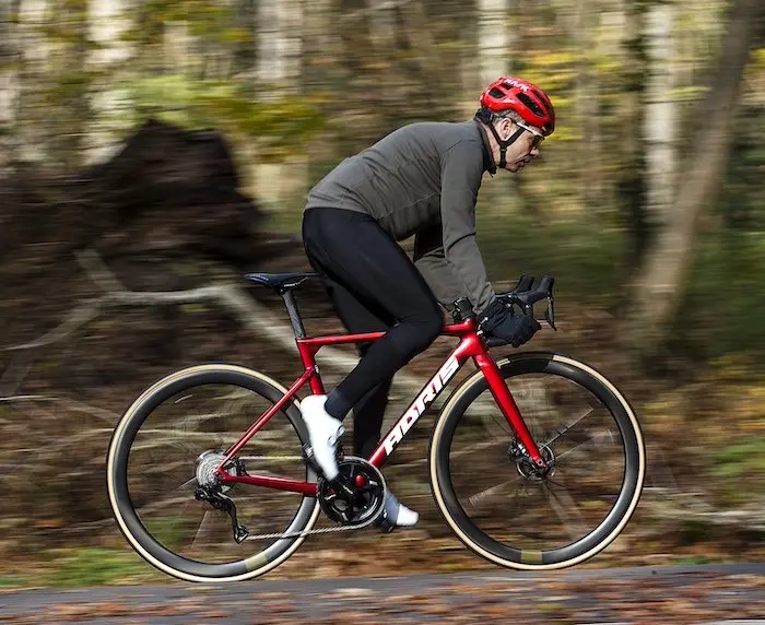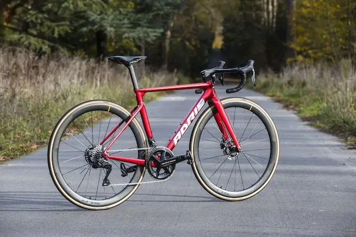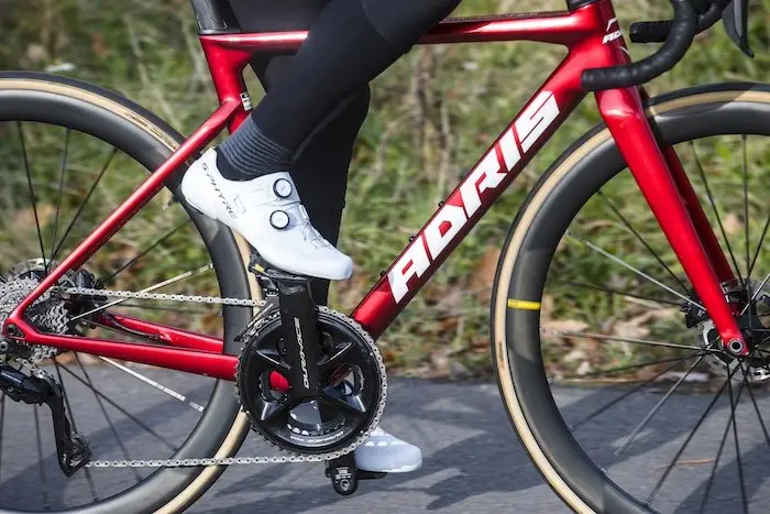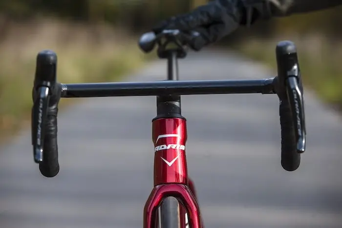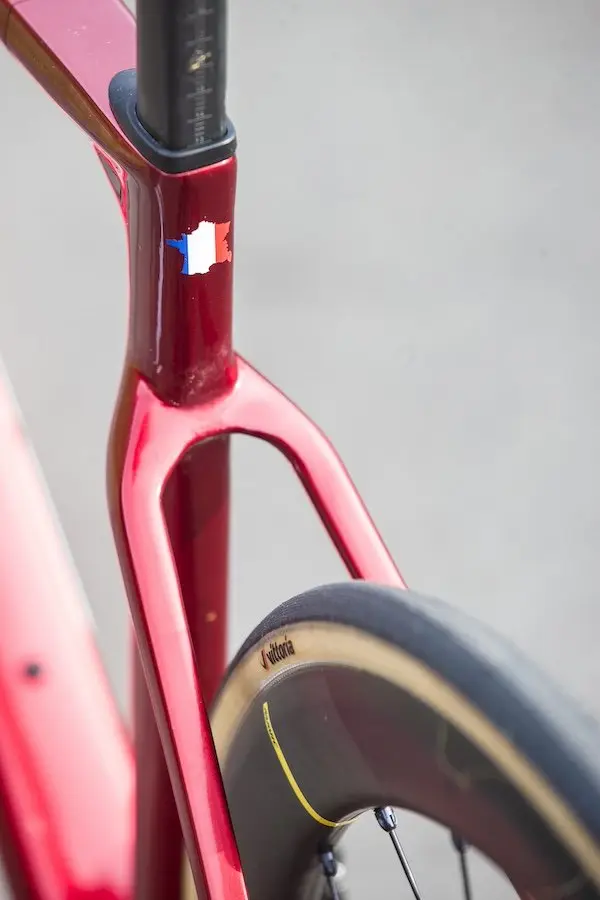 Dans cette version identique à celle des pros, on retrouve un montage en Shimano Dura-Ace Di2, avec donc des roues Mavic Cosmic SLR 45, une selle Italia SLR Boost Superflow et surtout les excellents pneus Vittoria Corsa Pro. Des pneus tubeless dont le prix public est de 95 € l’unité et qui se distinguent par un rendement, un grip et un toucher de route en général totalement hors du commun. Adris n’a donc fait aucune économie malvenue sur cette machine, proposée pourtant au prix de 8999 € avec cette magnifique peinture unie rouge chromé. Notons que ces jours-ci, la marque propose également une série limitée du Performance en bleu chromé, comme celui de l’équipe pro.